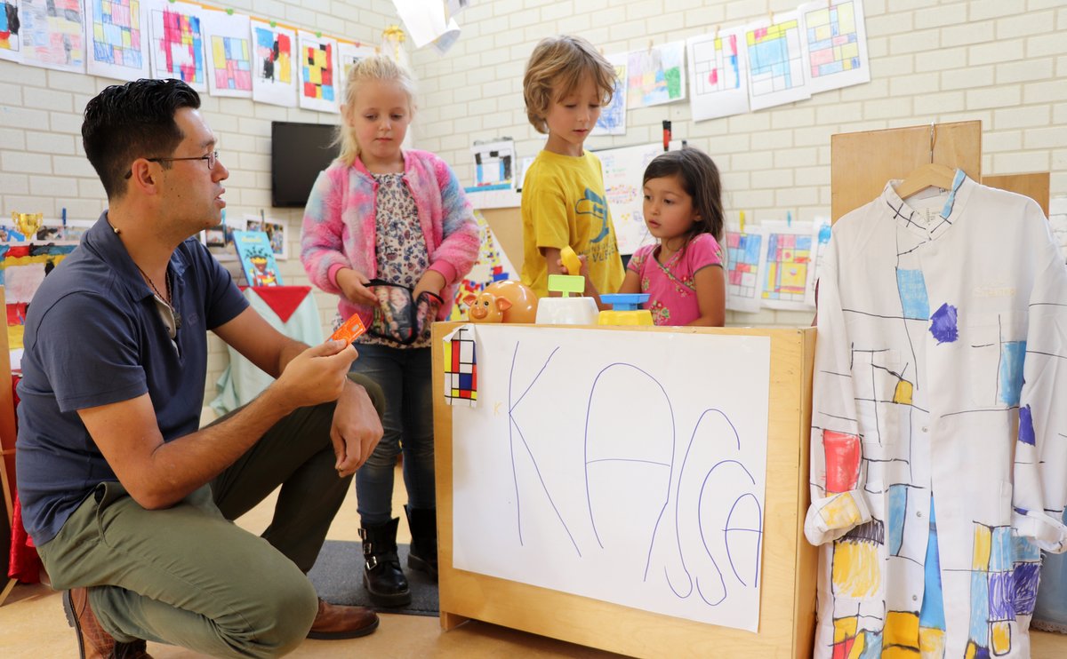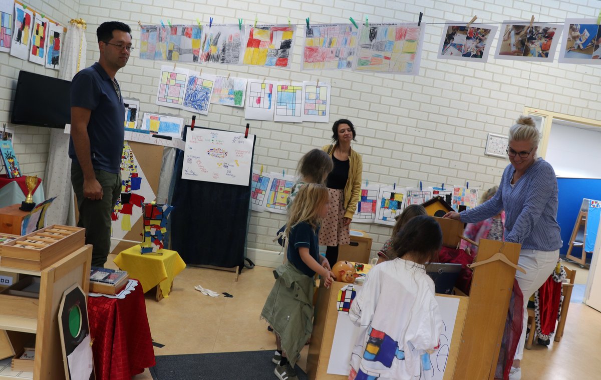 Het is een heel chique museum, vindt Vera (5). De kleuters maakten reproducties van beroemde schilderijen van Piet Mondriaan. Ze maakten zijn werk na op de kralenplank, schilderden vlakken in primaire kleuren en tekenden er op los. Deze werkjes zijn uiteindelijk verzameld in een heus Mondriaan-museum en Vera was de gids. In een overjas in Mondriaan-stijl leidde ze bezoekers rond langs de kunstwerken. Herkenbaar is Victory Boogie Woogie, het kunstwerk dat Mondriaan niet meer heeft kunnen afmaken voor hij overleed. Vera vindt vooral de kleuren erg mooi en weet te vertellen dat Mondriaan werkte met de kleuren rood, geel, blauw en zwart. We zien niet alleen veel schilderijen maar ook een vaas in Mondriaanstijl. Zelfs de overjas van Vera is door de kleuters ingekleurd. Het museum ademde in alles Mondriaan uit.